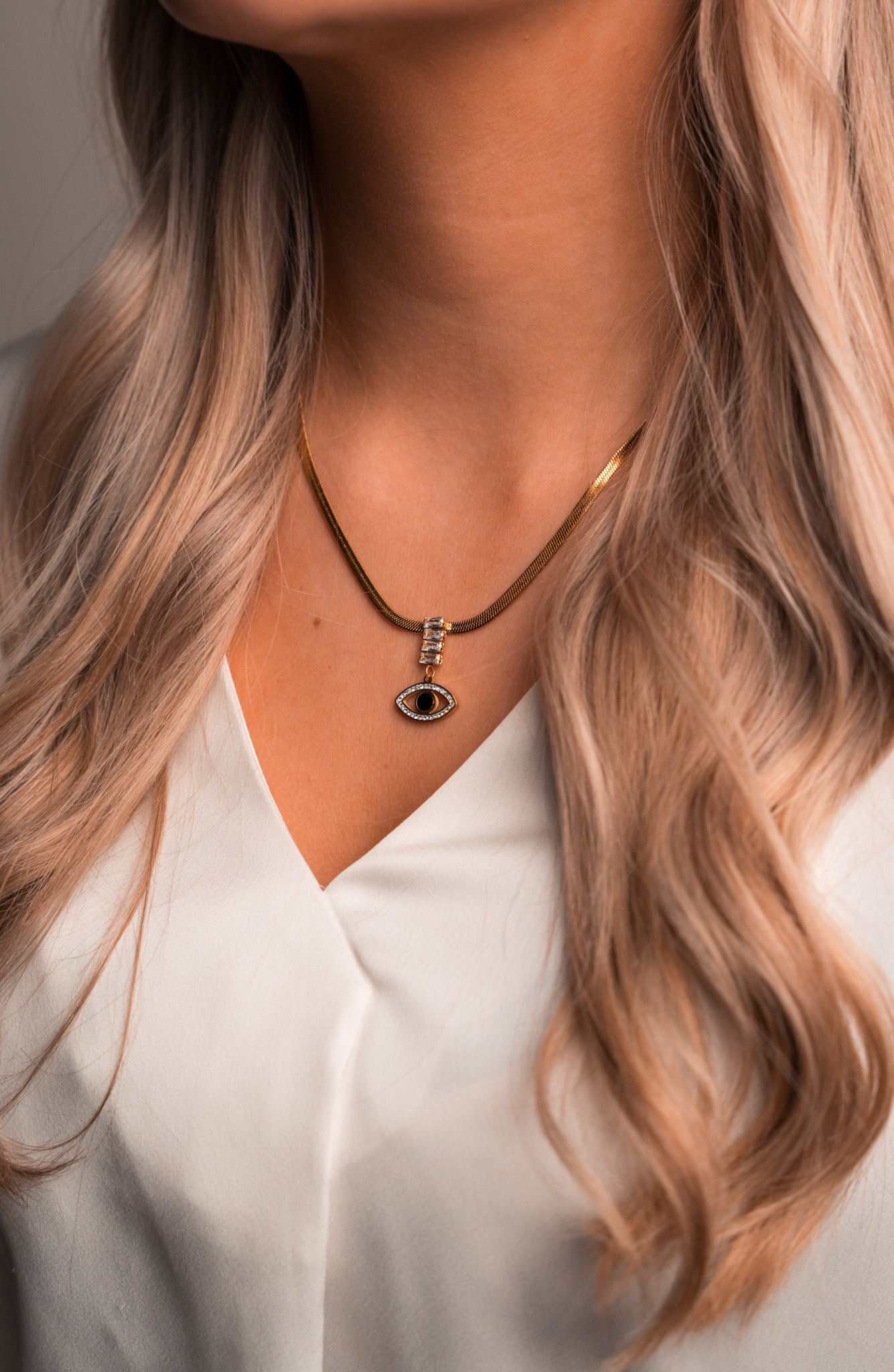 Ett elegant halsband i äkta silver med guldplätering, med en herringbone-kedja och en ögaberlock omgiven av glittrande zirkoniastenar, som ger en touch av mystik till din stil.