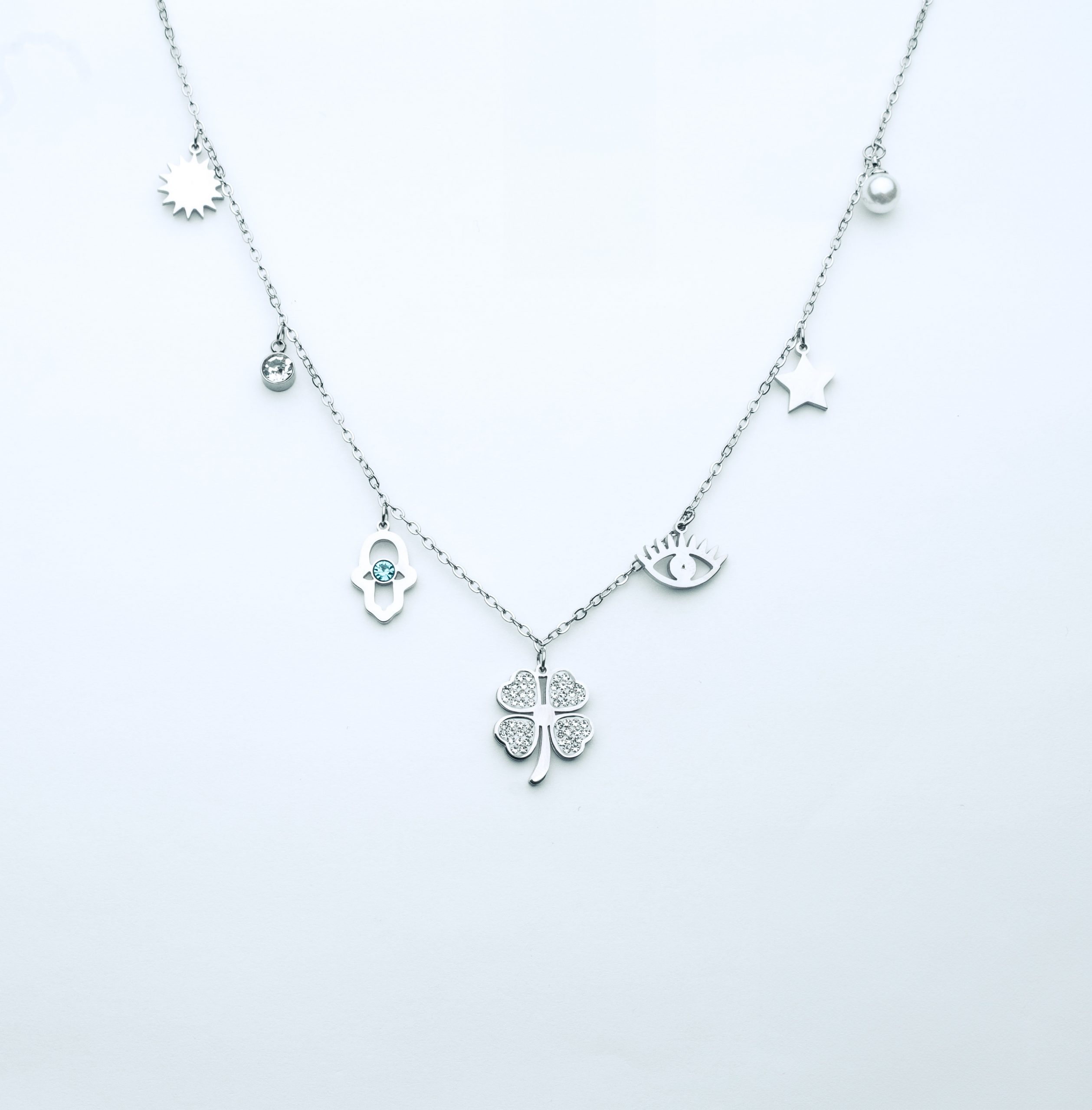 Detta halsband i rostfritt stål är en förtrollande samling av silvercharmar såsom klöver och ögat, varje detalj utsmyckad med en Kubisk zirkoniasten för en extra gnista. En perfekt present som bär på lyckobringande symbolik.